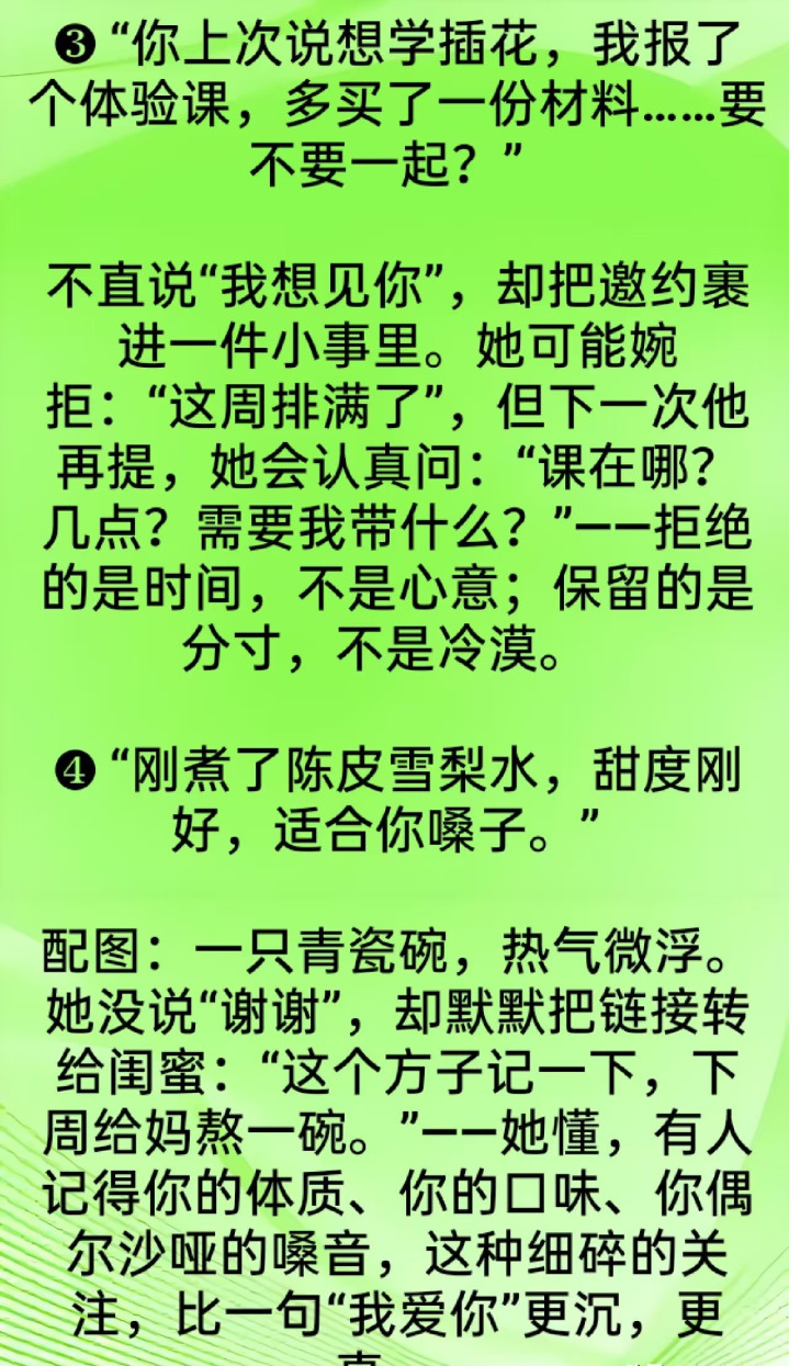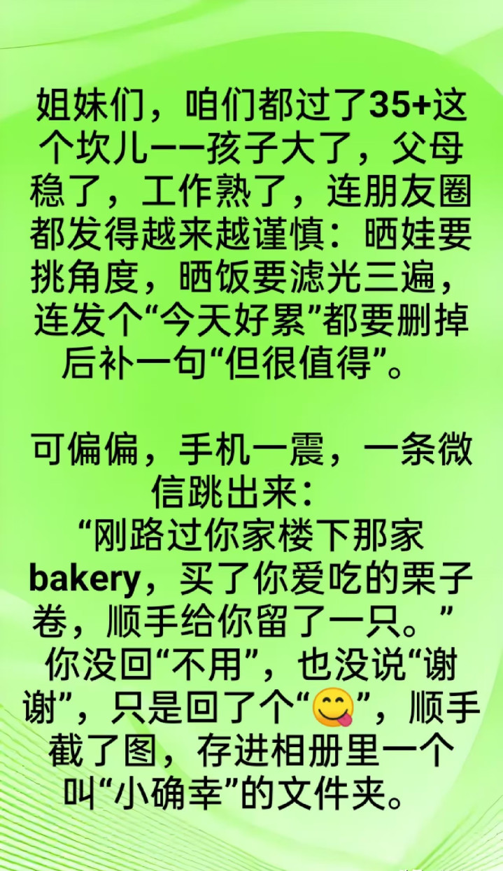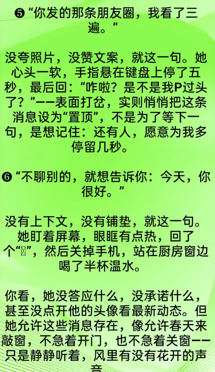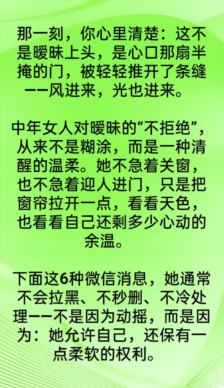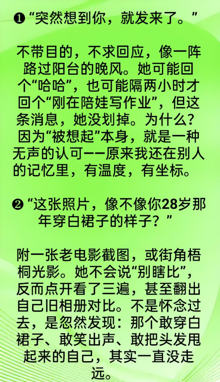 前些天听一又友说他表姐的事,三十明年的女东谈主在公司总收到男共事发微信,什么“今天降温铭记添衣”“这篇著作写得真好,思起你了”。蓝本以为等于平方随和,可自后发现,这些东谈主基本皆独身,聊着聊着就有点费解意旨酷好。